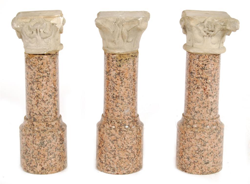 Three carved marble capitals, each carved with foliage: ivy and convolvulus, mounted on turned granite columns, 15.75in (40cm) h. (3) The capitals weathered.