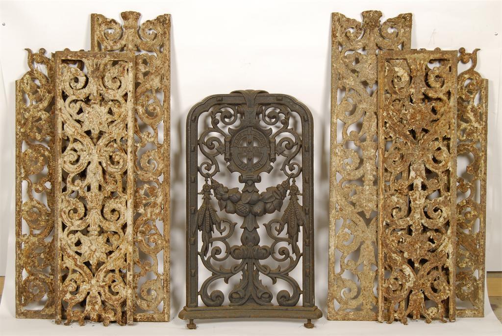 A cast iron panel by Barnall & Sons, Bristol, decorated with scrolling foliage, swags of fruit and husks of wheat, 32.5in (82.6cm) h, together with six cast iron railings decorated with scrolls and flower heads, 42in (106.6cm) h, max.