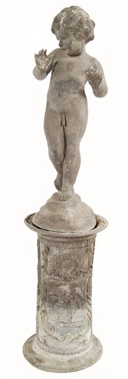 A lead figure of a boy, standing on a rocky mound together with a lead column cast with cherubs within scrolling foliage, dated '1861', figure: 21.75in (55.4cm) h, column: 14.75in (37.5cm) h. (2)