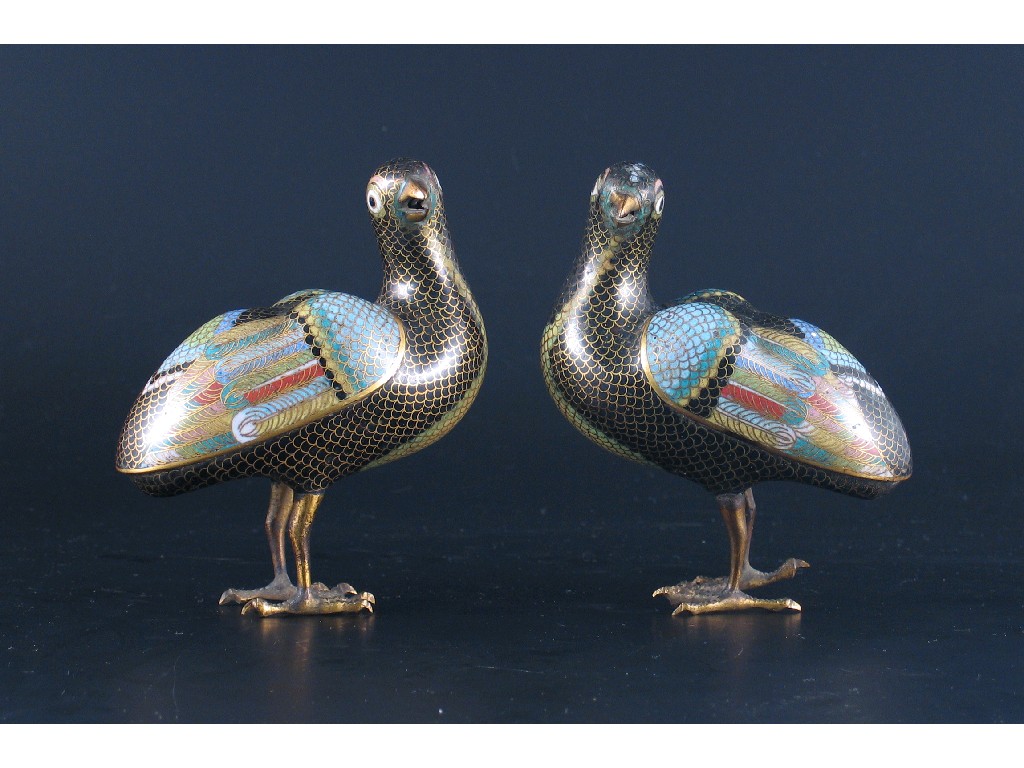 A small pair of Chinese cloisonn models of partridges, with colourful plumage and with their heads turned to the side. Each with minor damage. 19th century, 13cm. (2)