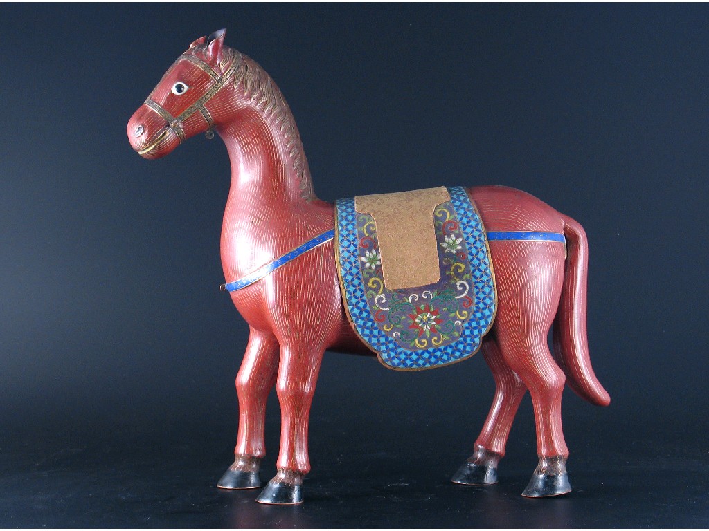 A Chinese cloisonn model of a horse, the saddle cloth decorated with lotus, 36cm. High.