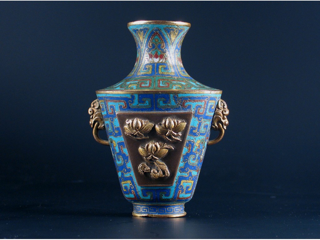 A Chinese cloisonn wall vase, decorated with a panel applied with three gilt flowerheads, 18th/19th century, 15cm.