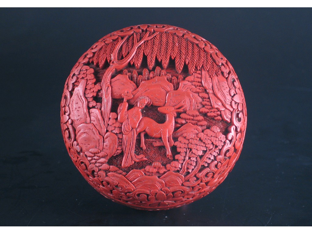 A Chinese carved red lacquer circular box and cover, decorated with four figured and a deer beneath a tree, probably 19th century, 12cm. (2)