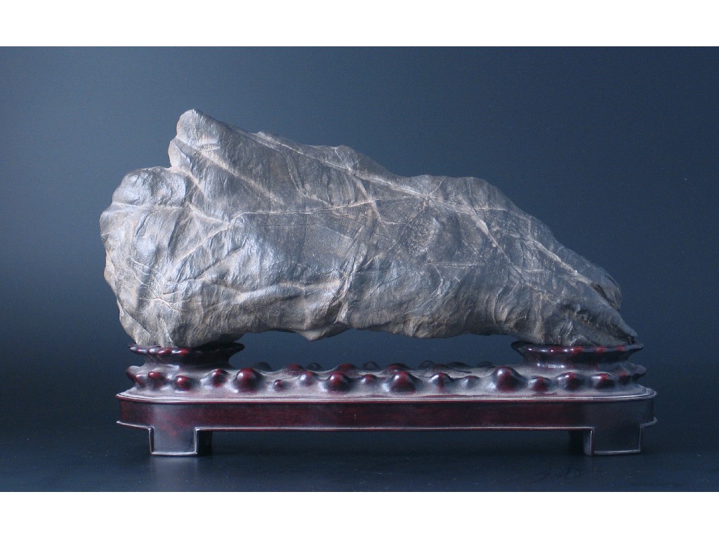 A Chinese Scholar's rock, the black rippled stone with striations and raised on a carved hardwood stand, 36cm. (2)