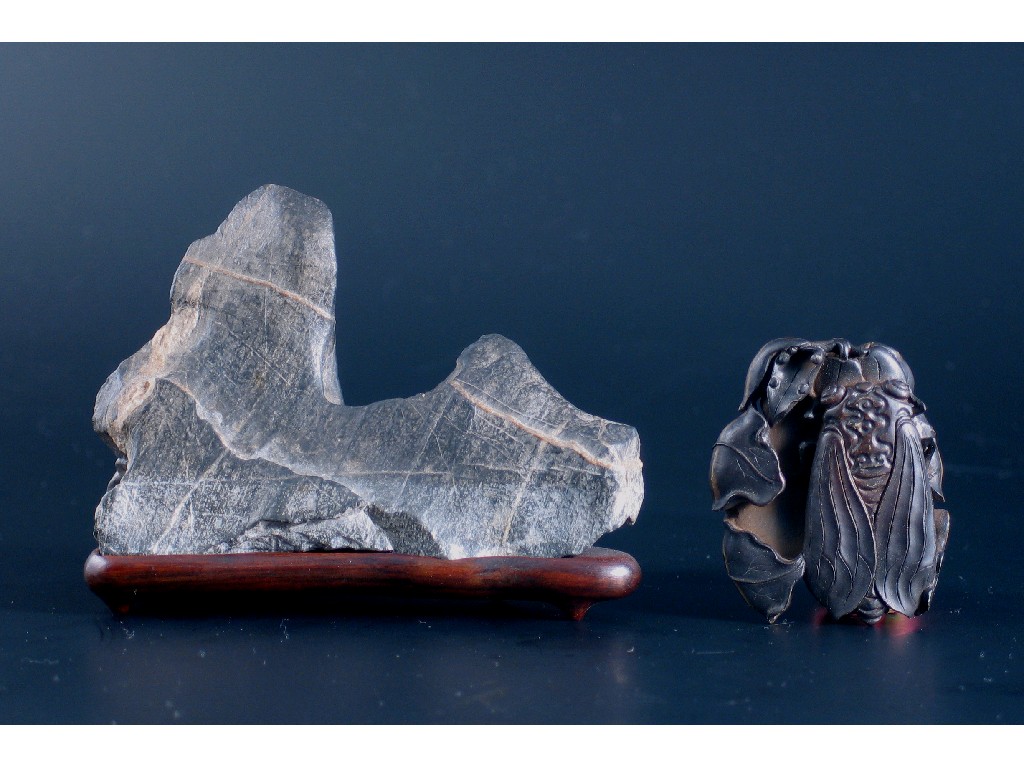 A small Scholar's rock, the black stone with white veining, raised on a wood stand, and a small pottery model of a cicada crouched amidst leaves, moulded four character seal mark, 12cm. Max. (3)