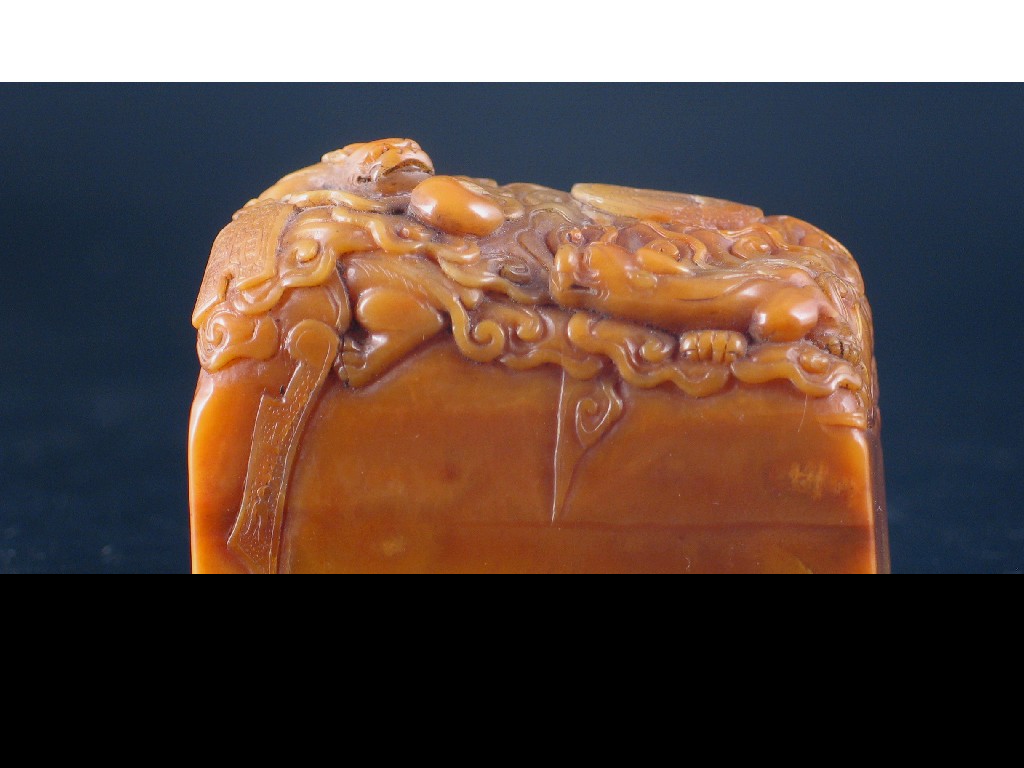A Chinese soapstone rectangular carving, with two mythical beasts creeping amidst scrolls, 7.5cm.