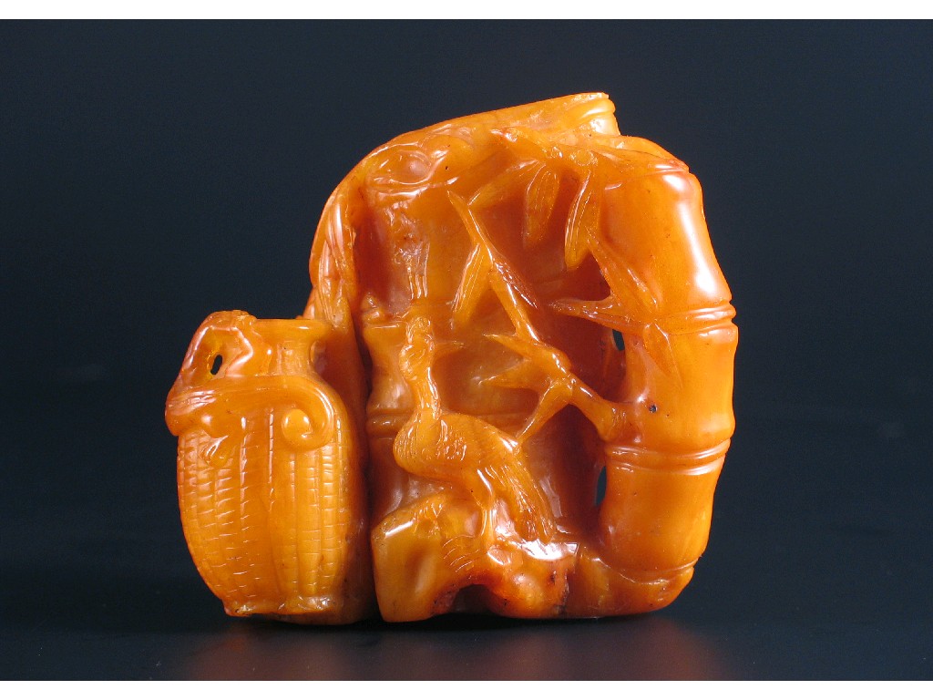A Chinese amber vase, carved as bamboo stems, a bird and another creature climbing into a basket, 18th/19th century, 8cm.