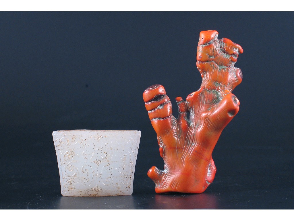 A small carved hardstone plaque, and a piece of coral, 10cm. Max. (2)