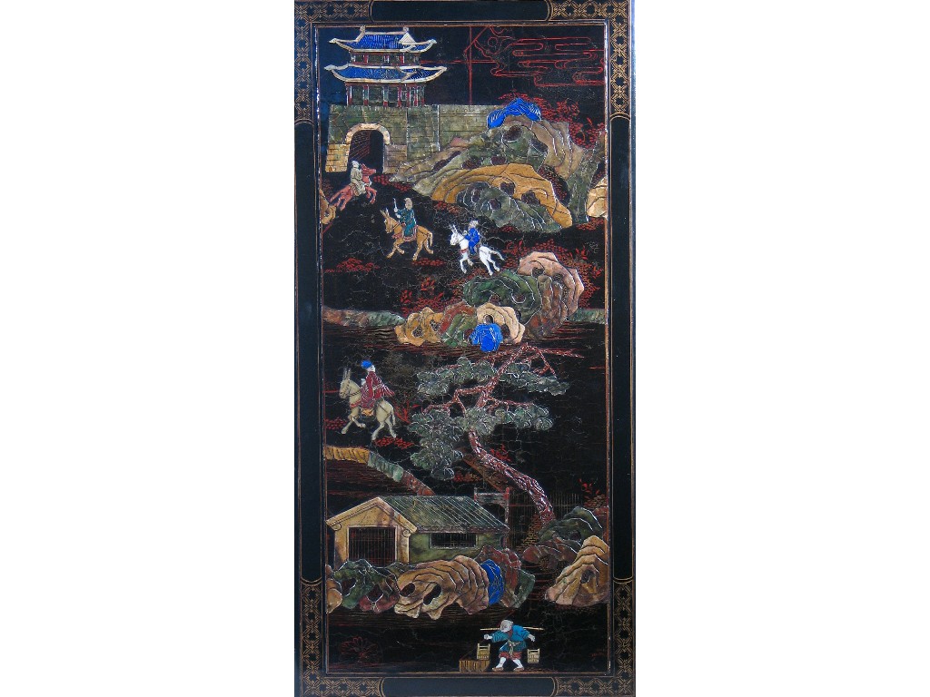 A black lacquer rectangular table, the top with a panel inset with mother-of-pearl and coloured stones depicting equestrian figures, pagodas, rocks and an old gnarled tree, the panel probably 17th century, 95cm. Long, 47cm. Wide.