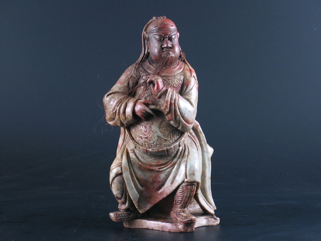 A Chinese soapstone carving of Guandi, the God of War, seated on a throne and applied with hair for his beard and whiskers, 17th/18th century, 21cm.