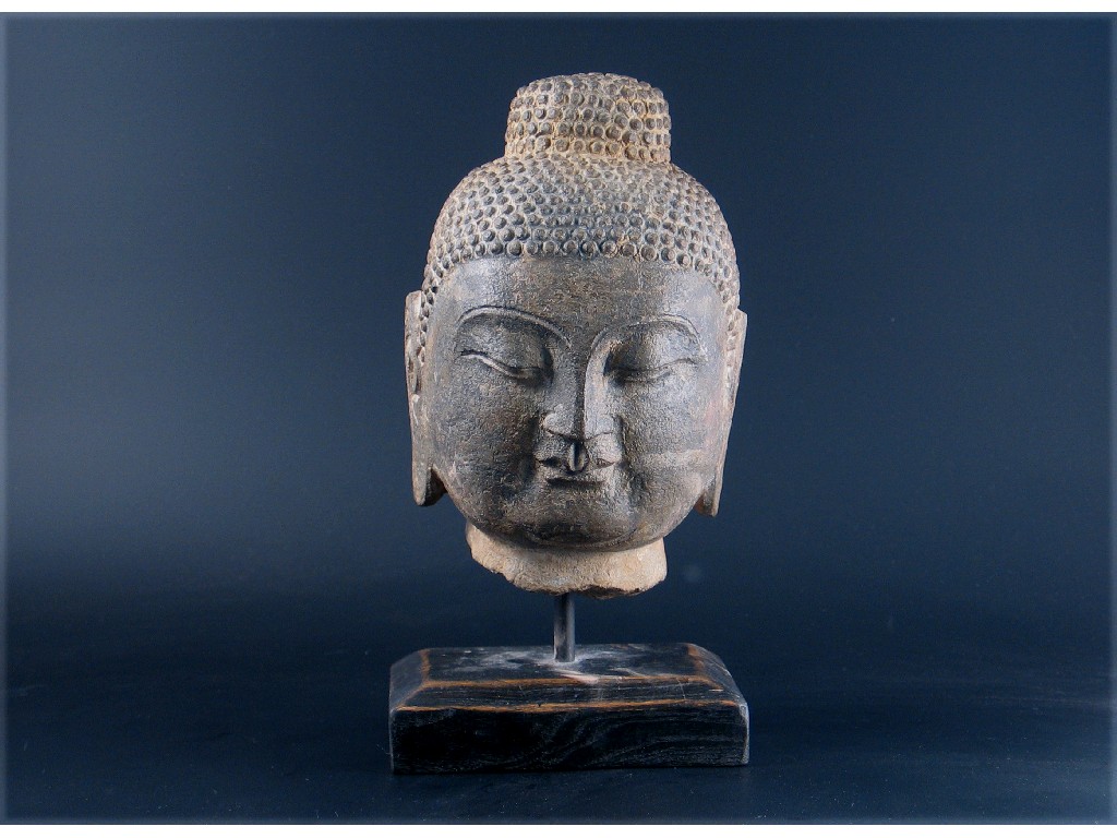 A Chinese stone head of Buddha, raised on a wood stand, 23cm. (2)