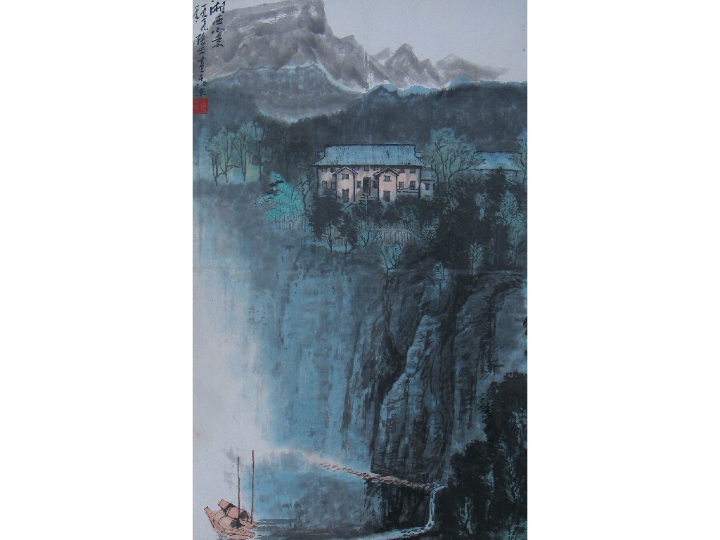 A Chinese scroll painting, of a view of Huxi by Zhang Bo and dated 1979, 68cm. x 45cm.
