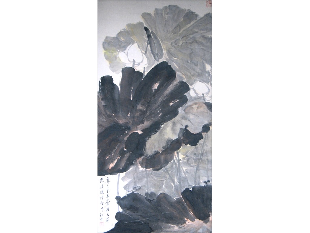 A Chinese scroll painting, of large sylized lotus, by Wang Jiqian (C C Wang, 1914-2003), 136cm. x 68cm.