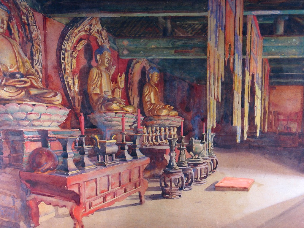 A framed watercolour of a temple interior, 19th/early 20th century, 51cm. x 63cm.