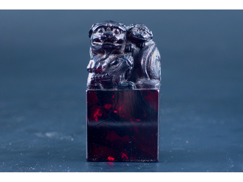 A Chinese carved amber or resin seal, with a lion dog surmount and two puppies, 19th century, 6.5cm.