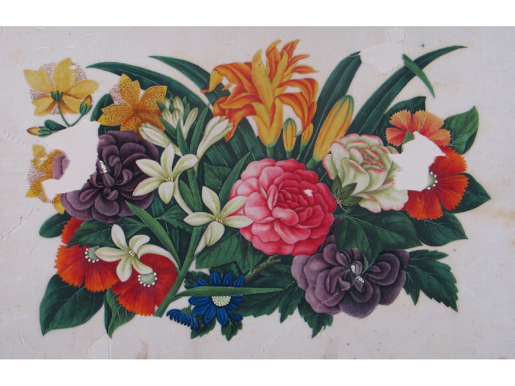 A leather bound album, containing a collection of thirty seven Chinese rice paper paintings, depicting flowers, figures, landscapes and other subjects including Napoleon. Damages. 19th century.