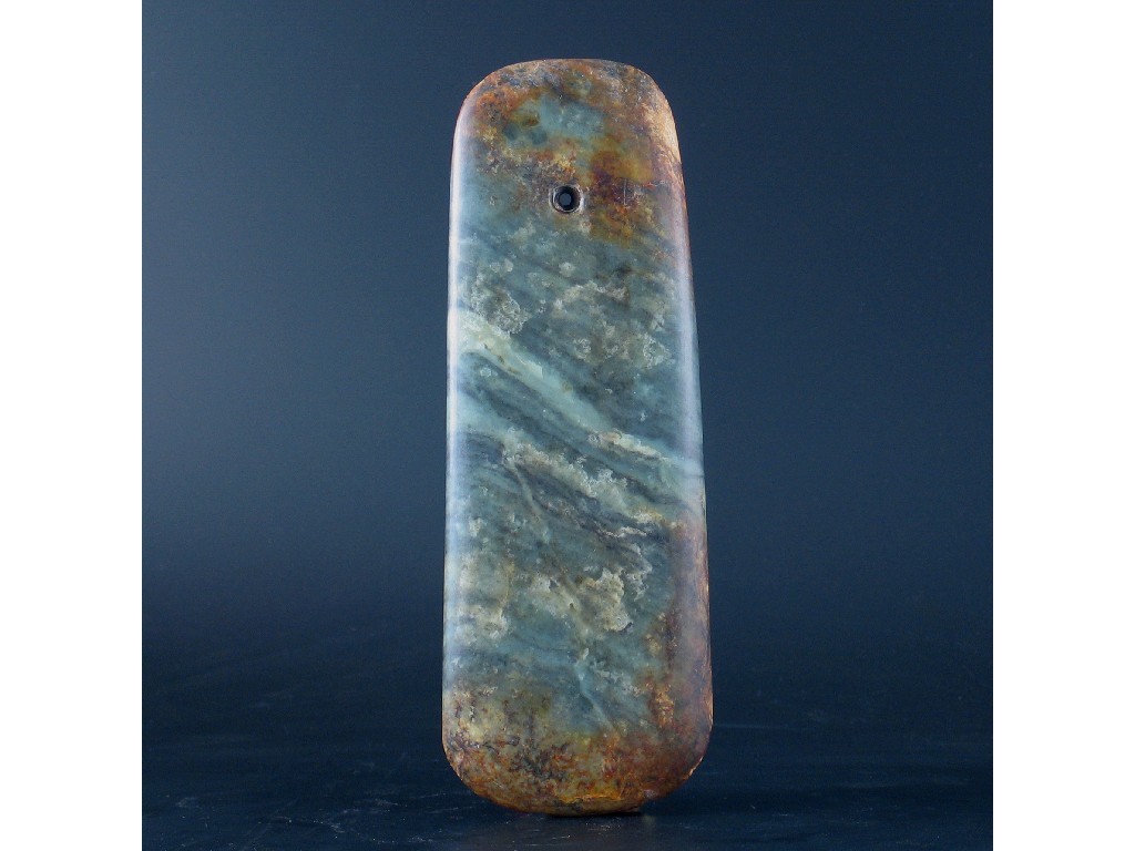 A Chinese jade axe head, the green stone with brown flecks, probably Neolithic, 26cm.