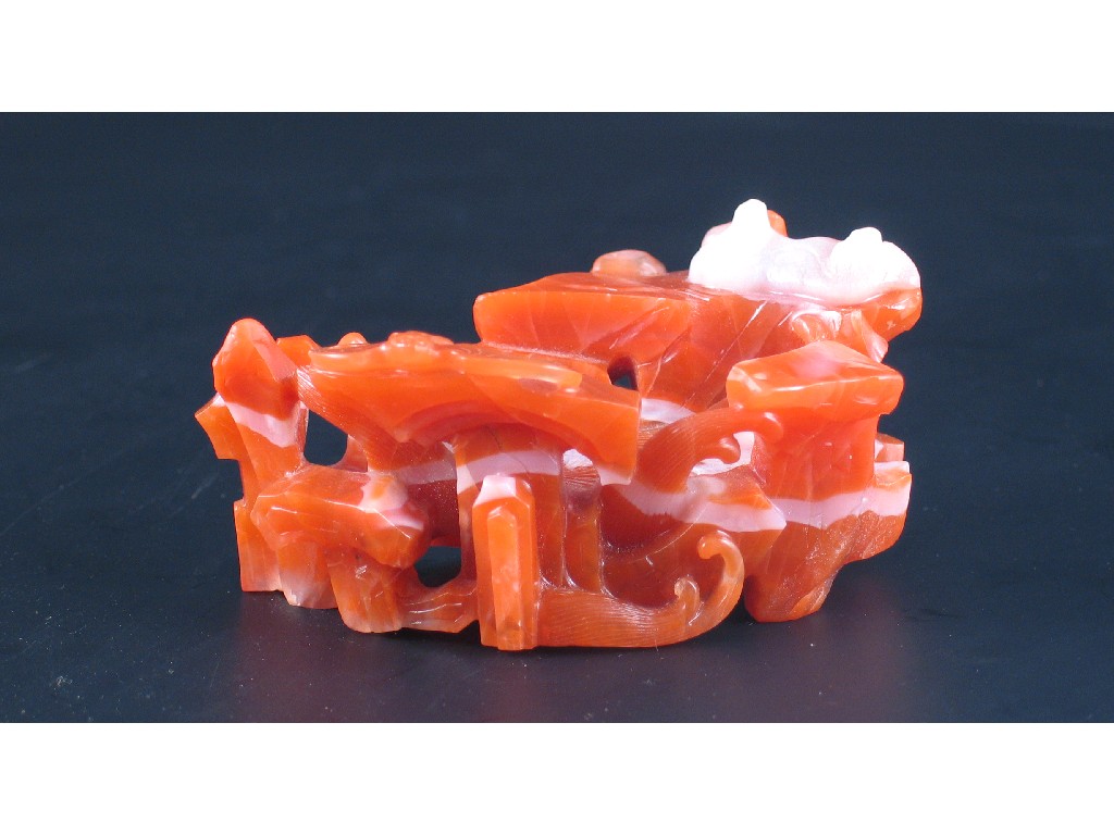 A Chinese hardstone carving of a whirlpool, the orange stone with pale striations and carved with a bat and a figure around the rocks. Minor faults. 11cm. Wide.