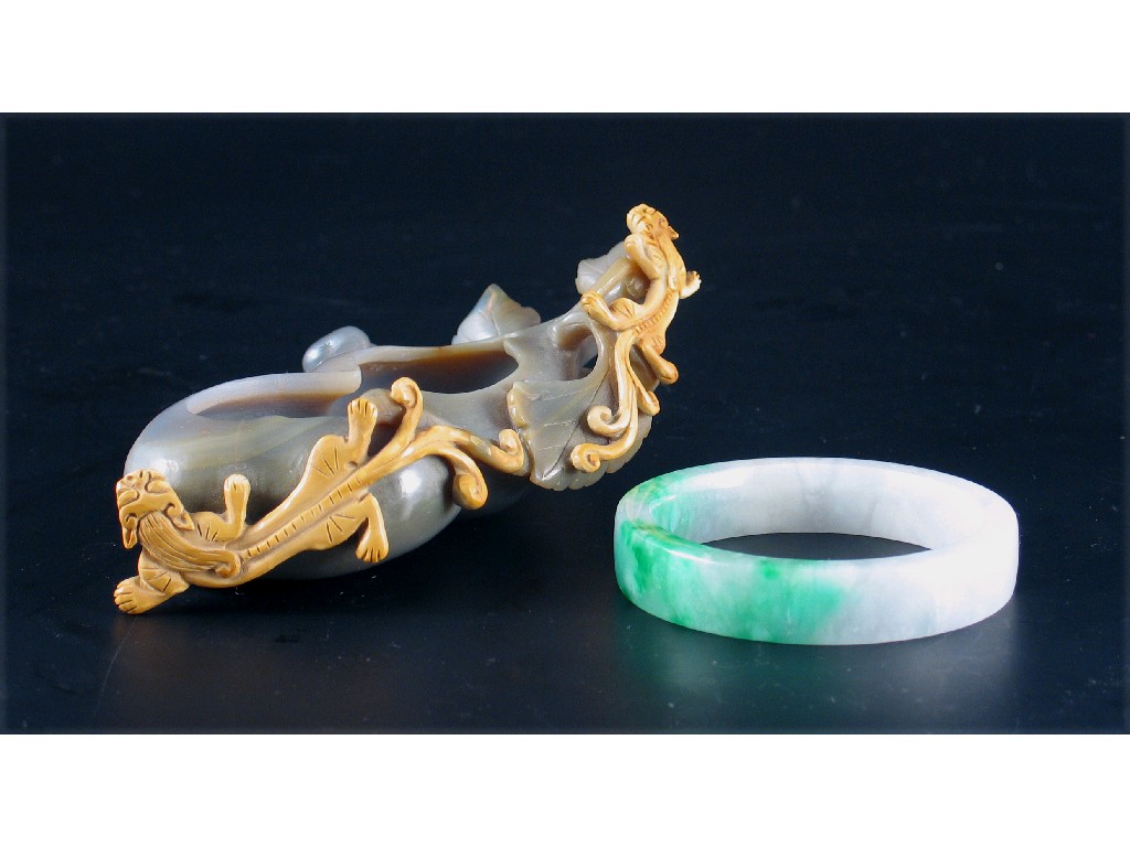 A Chinese agate gourd shaped brush washer, with two chilong clambering amidst the leaves, 19th century, together with a jade bangle, 14cm. Max. (2)