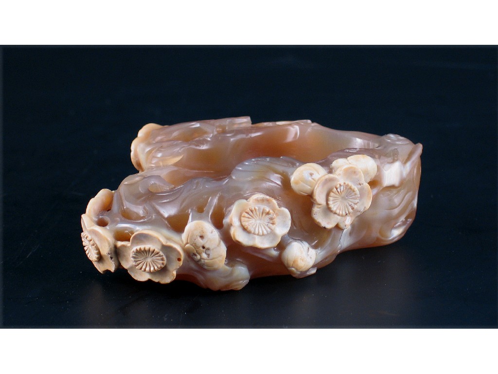 A Chinese agate brush washer, carved with prunus around the rim, 18th/19th century, 12cm.