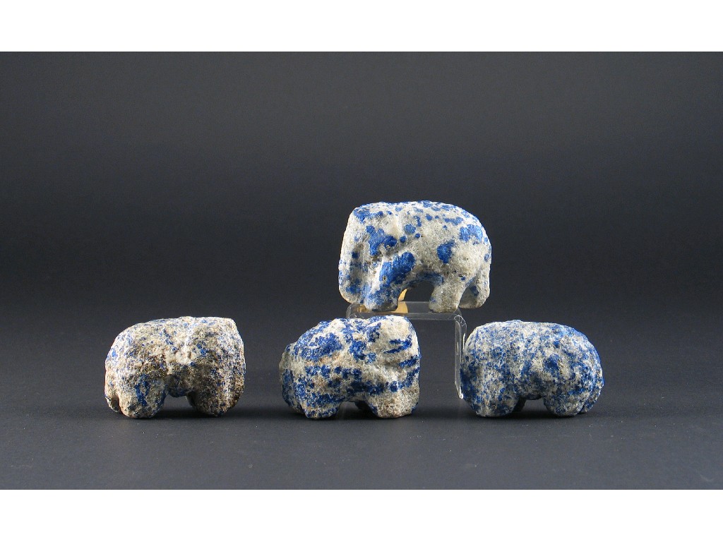 Four Chinese lapis lazuli carved models of elephants. Extensive wear and damage. Probably Shang dynasty (c.1500-1028bc), 6.5cm. Max. (4)
