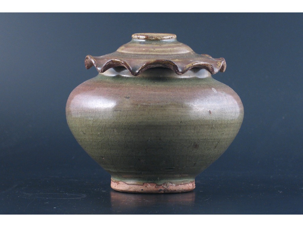 A Chinese green Junyao vase and cover, with a compressed circular body, the cover with a scalloped rim, probably Song/Yuan, 17cm. (2)