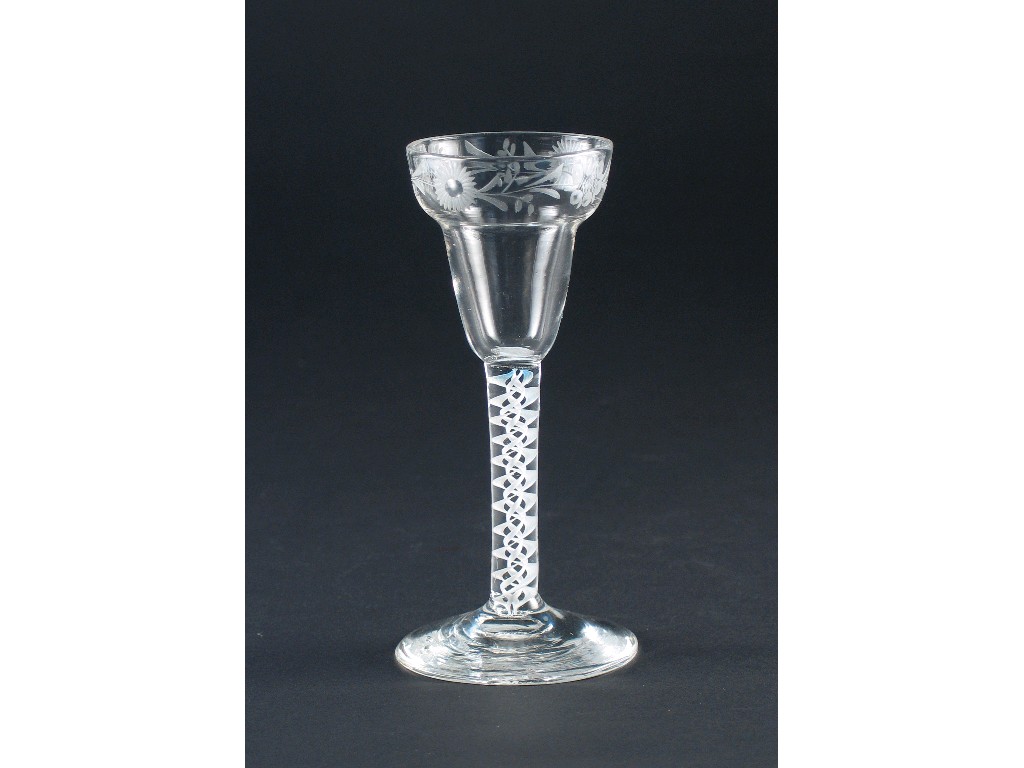 A wine glass, the pan-topped bowl engraved with a band of flowers and leaves, raised on an opaque twist stem, c.1770, 13.2cm.