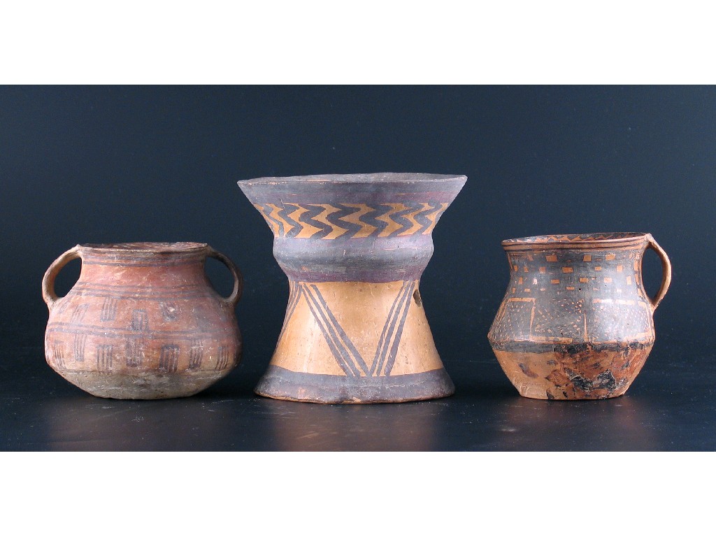 Three Chinese Neolithic vessels, one a flared tazza, the others with a single and double handle respectively, c.2000BC. 13cm. (3)