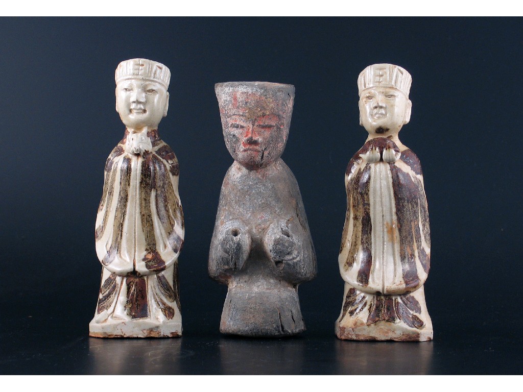 A Chinese Han dynasty figure, of a kneeling musician and two Cizhou style figures, perhaps 10th century, 18cm. Max. (3)