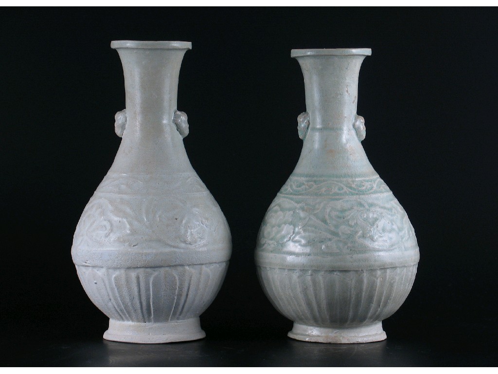 A pair of Qingbai pear-shaped vases, moulded with peony, Song dynasty 960-1279AD, 23cm. (2)