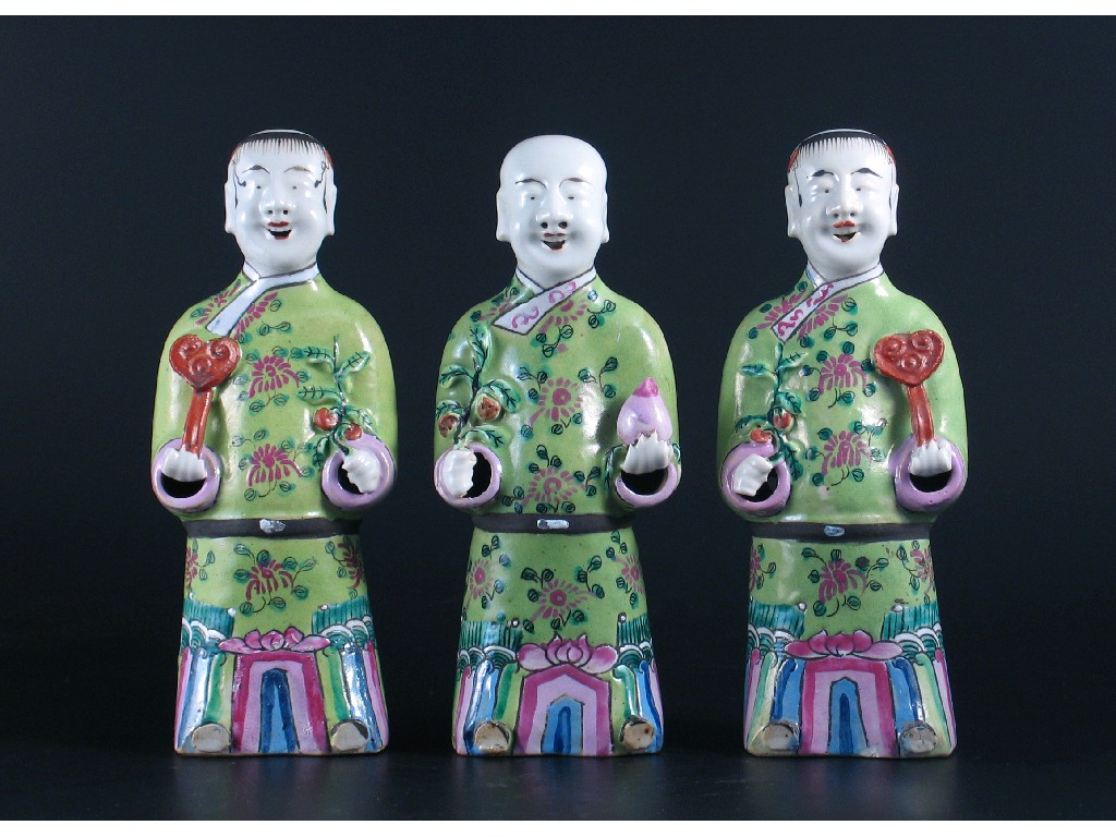 Three Chinese famille rose models of standing boys, all wearing green robes, c.1800, 21cm. (3)