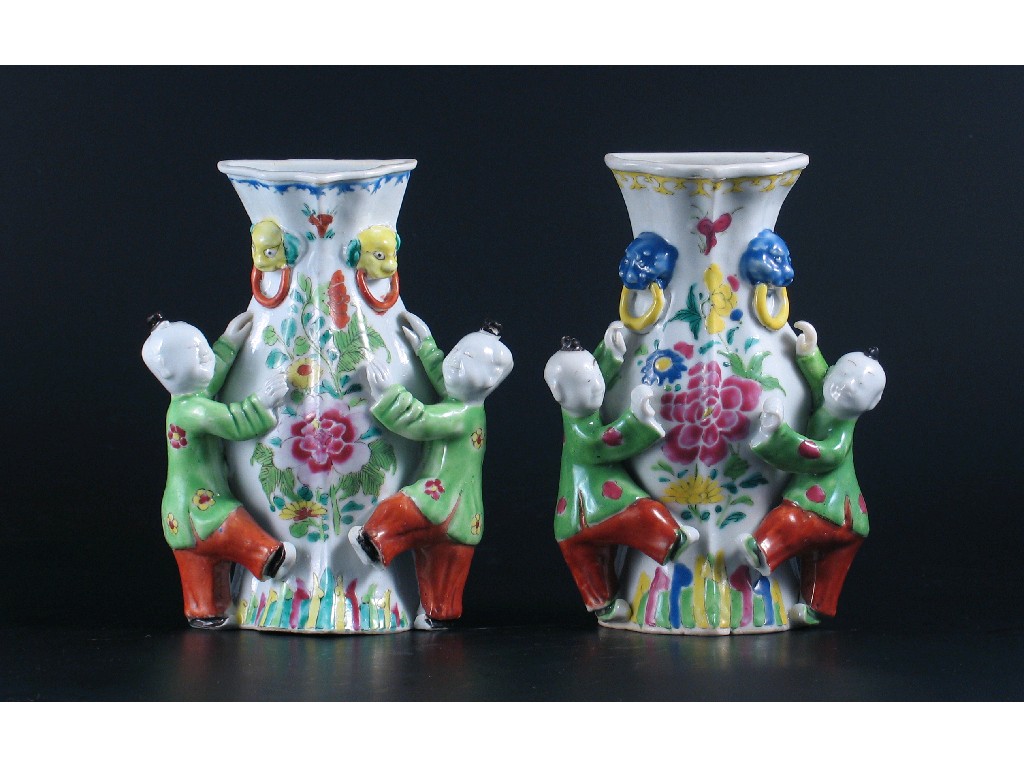 Two Chinese famille rose wall vases, each with animal mask and ring handles and flanked by boys wearing green jackets. Minor restorations. Qianlong 1736-95, 17cm. (2)