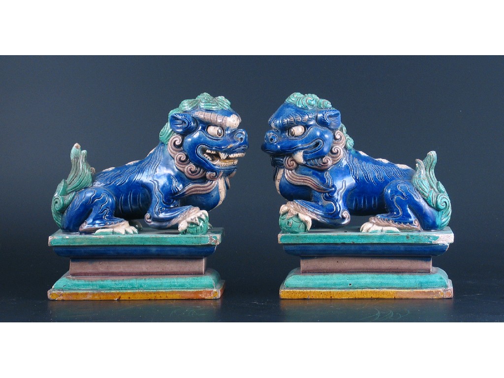 A pair of Chinese blue, turquoise and green glazed models of lion dogs, standing on rectangular plinths. Some damages. 19th century, 17cm. Long. (2)