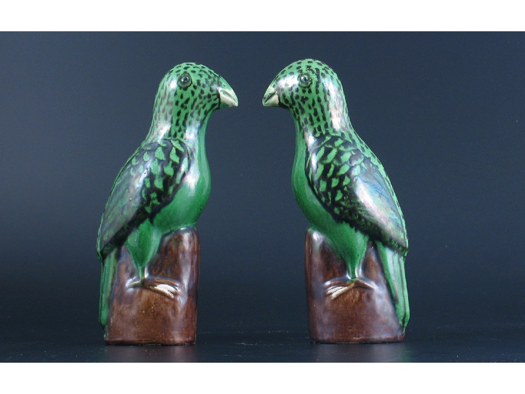 Two Chinese green-glazed models of parrots