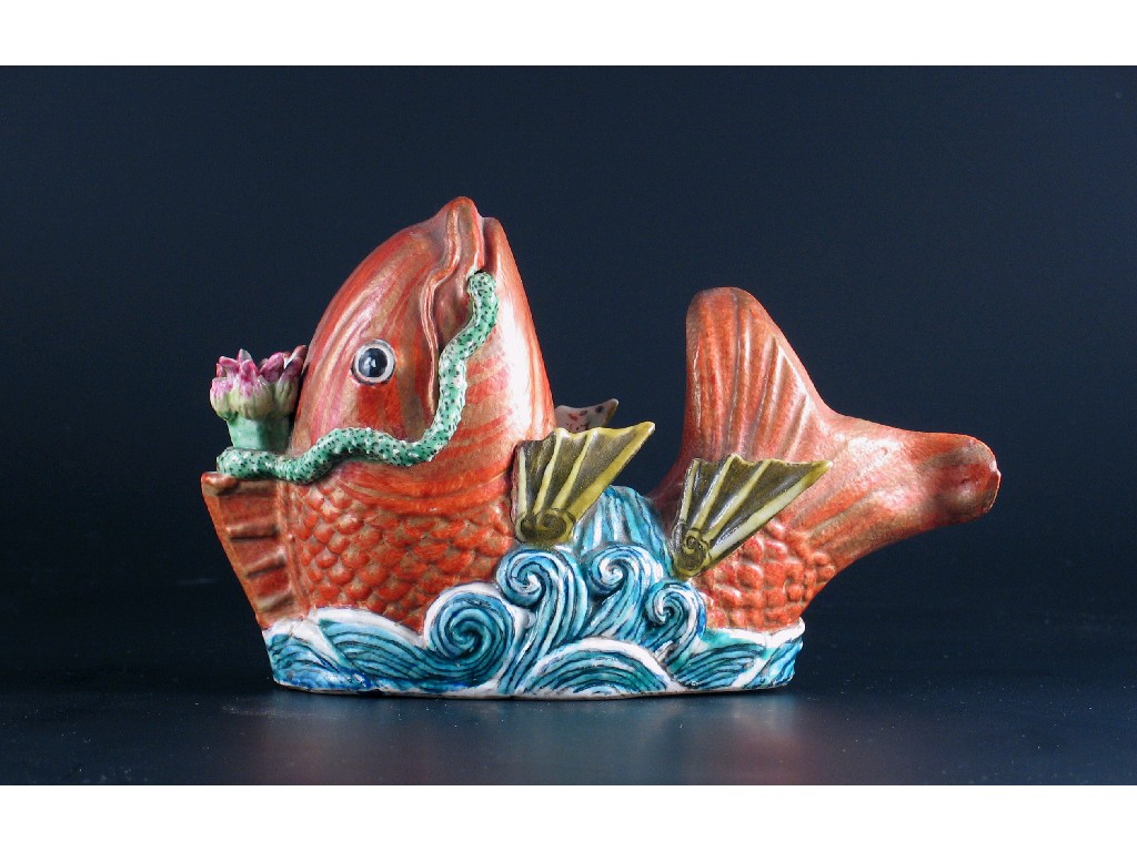 A Chinese famille rose model of a carp, leaping from waves and holding a lotus stem in his jaws. Small chips to the lotus flower. 19th century, 23cm.