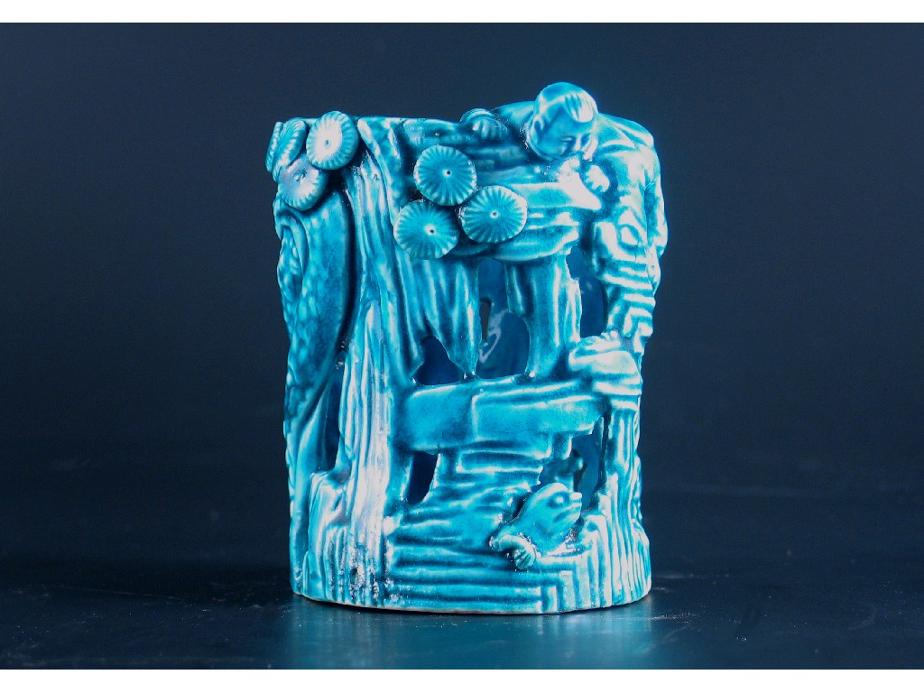 A Chinese turquoise glazed porcelain brushpot, with reticulated sides formed as a boy climbing a pine tree. Minor repairs. Kangxi 1662-1722, 10cm.