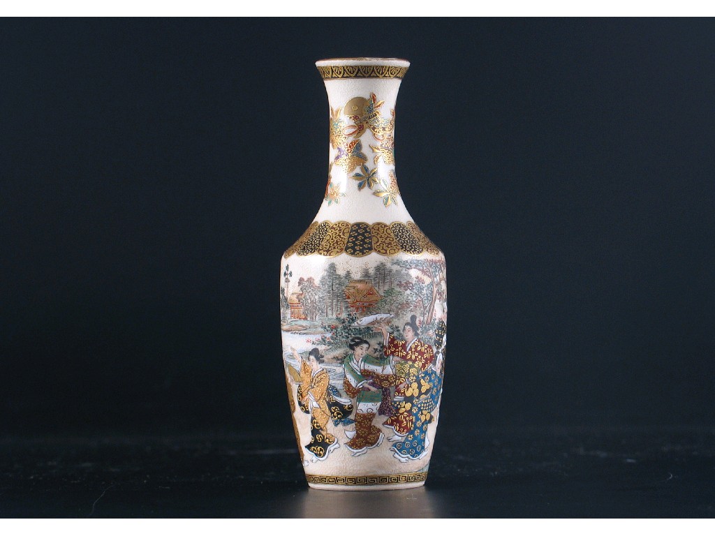 A small Japanese Satsuma bottle vase, painted with a procession of musicians and dancing figures, signed Hozan, Meiji 1868-1912, 11.8cm.