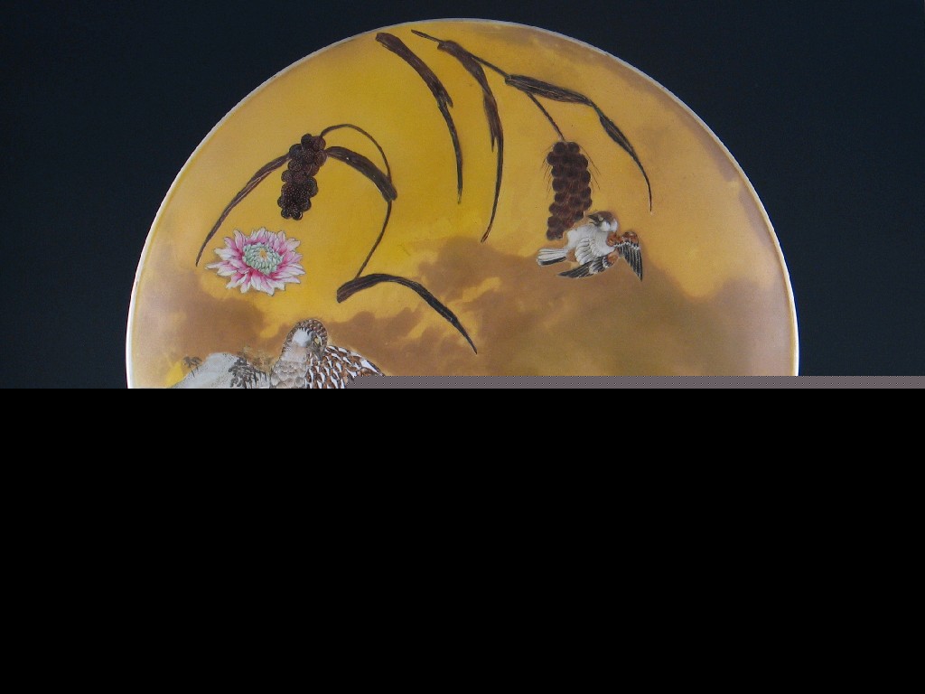 A large Japanese Fukugawa dish, decorated with a sparrow and two quail, impressed mark, early 20th century, 46cm.