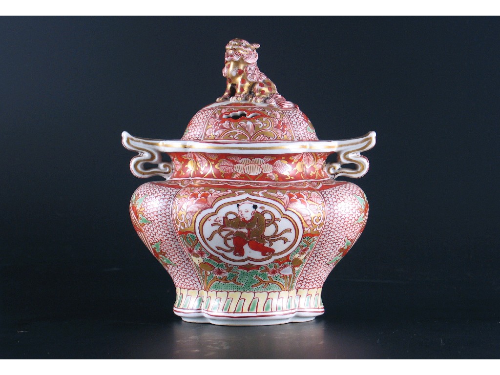 A Japanese Kutani koro and cover, with a quatrelobed body and a shi shi knop, decorated with panels of boys and phoenix, 19th century, 14.5cm. Wide. (2)