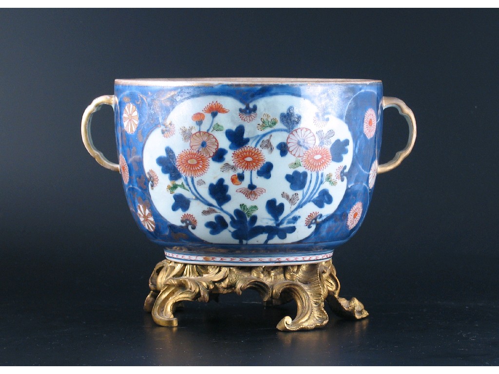 A Japanese Imari two-handled bowl, decorated with panels of chrysanthemum and raised on an ormolu stand. Restoration. The porcelain 18th century, 28cm. Wide.