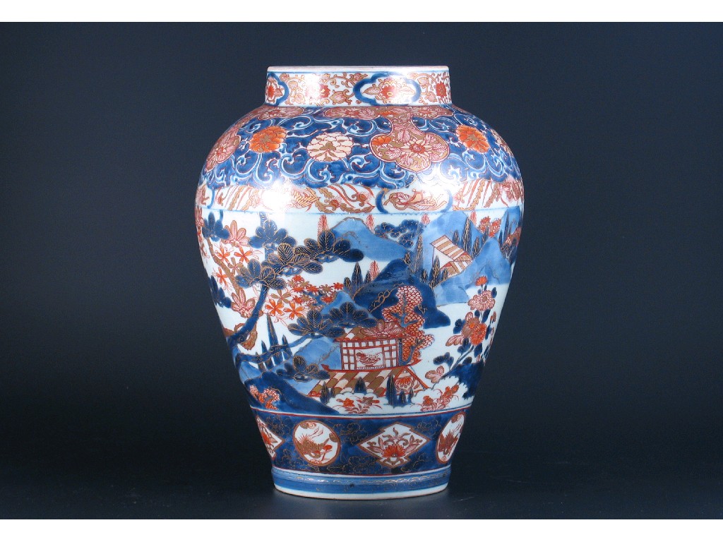 A Japanese Imari baluster vase, typically decorated with peony, chrysanthemum, pine and prunus, c.1700, 33.5cm.