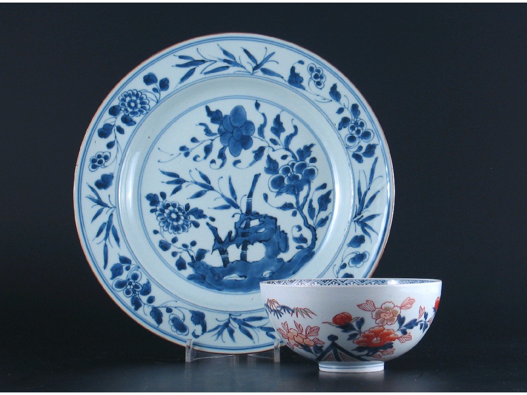 A Japanese Imari bowl, and a Chinese blue and white plate, both painted with flowers and foliage, early 18th century, 27.5cm. (2)