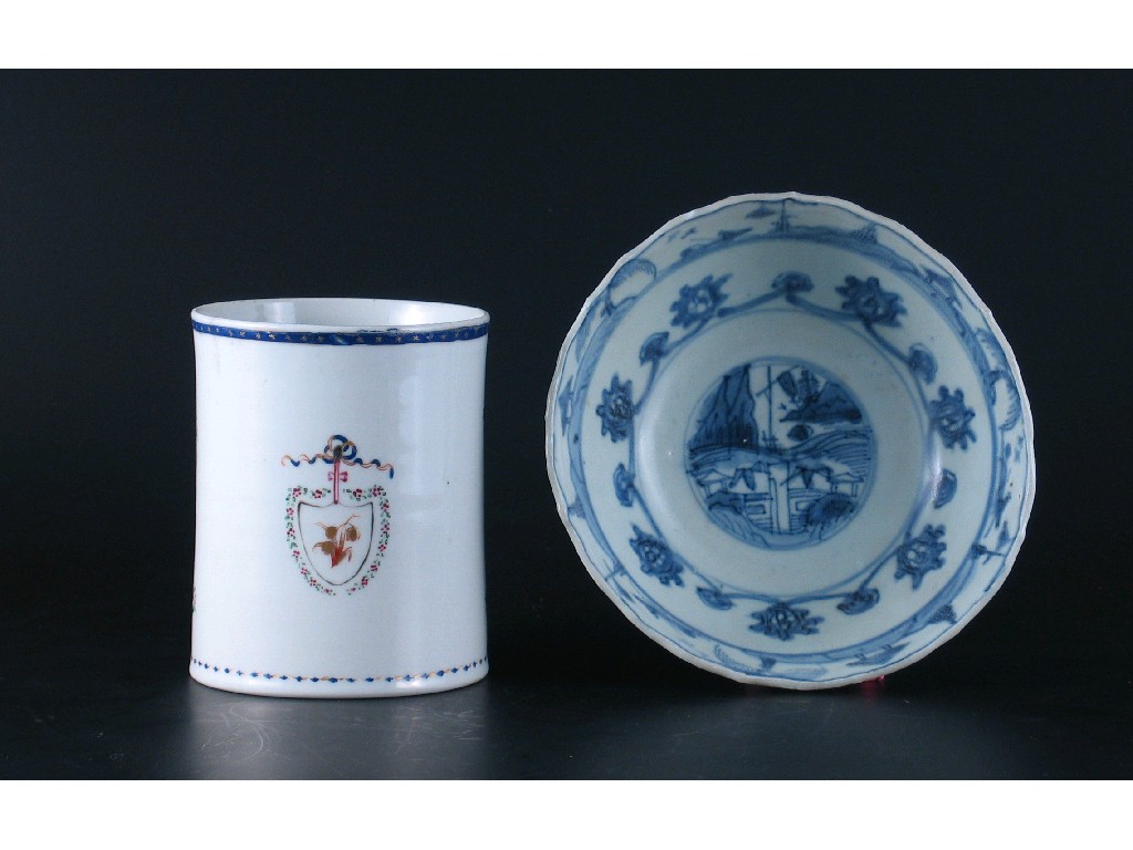 A crested Chinese famille rose mug, painted with flower sprigs beneath a blue border, 18th century, and a Chinese blue and white bowl, probably Wanli, 17cm. Max. (2)