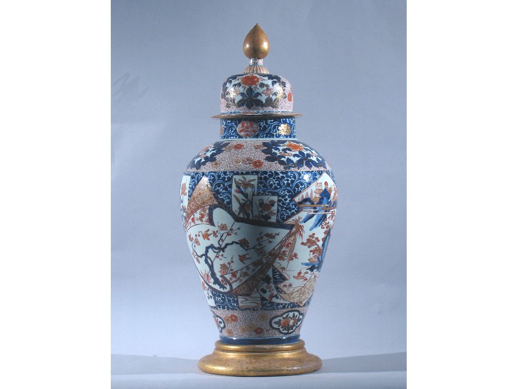 A massive Japanese Imari baluster vase and cover, typically decorated with panels containing pine, prunus and rockwork and detailed in gilt. The cover with a small repaired rim chip and a replacement wooden knop. c.1700, 88cm. Together with a gilt wood stand. (3)