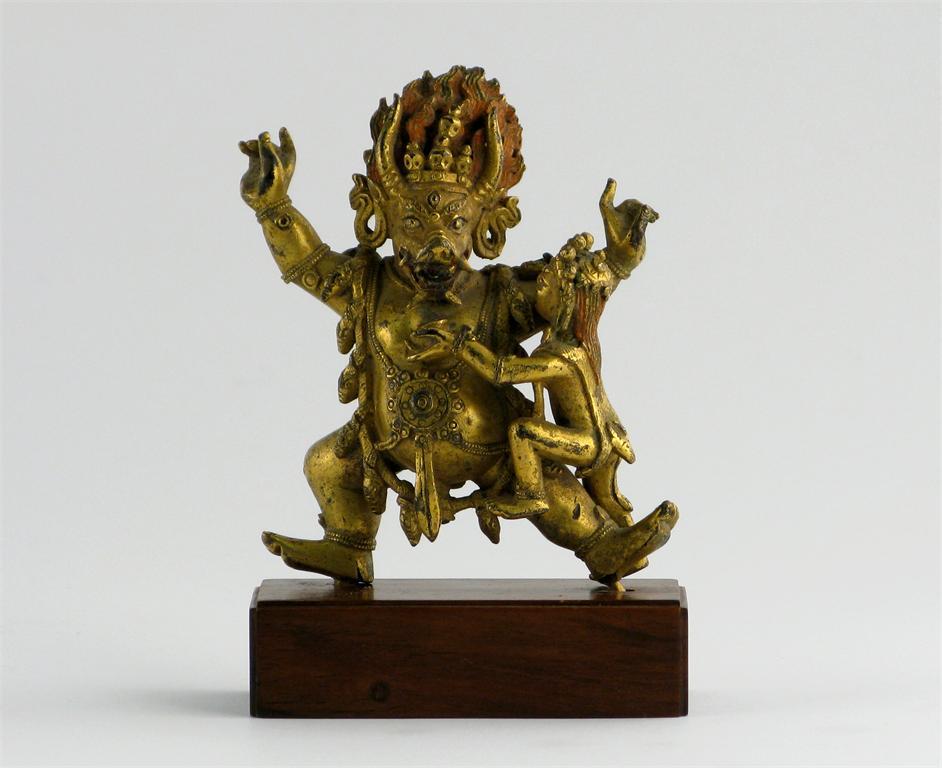 ** A Tibeto-Chinese gilt bronze figure of Yama, the god of death, with his shakti by his side holding a skull bowl in her left hand, traces of orange pigment in the figures' hair, 18th century, 10.5cm.