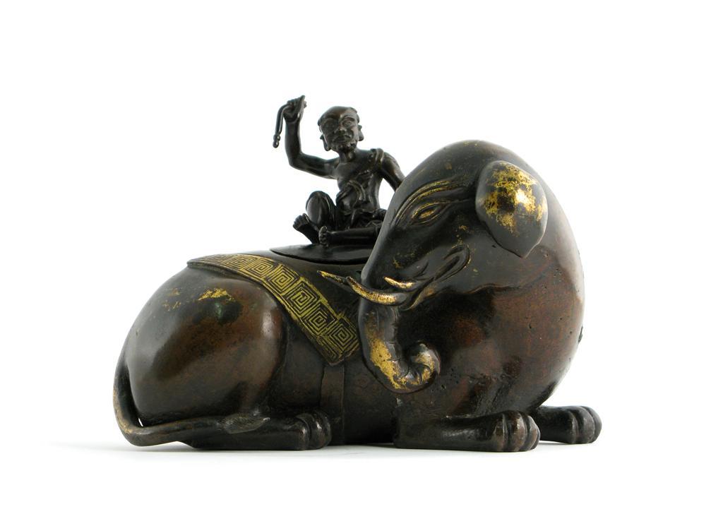 ** A Chinese gilt bronze incense burner, in the form of a recumbent elephant, his head turned to the right, a figure of an ascetic seated on the reticulated lid, 17th/18th century, slight wear, 23cm. (2)