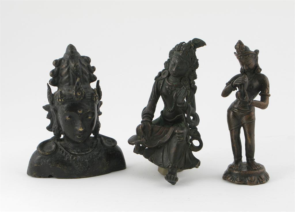 Two bronze and one copper figure, one a bust of a woman wearing an elaborate headdress, a figure in tribanga holding a conch shell, the third probably Tara wearing a long necklace from a larger piece, 17th century and later, damages, 14cm. (3)