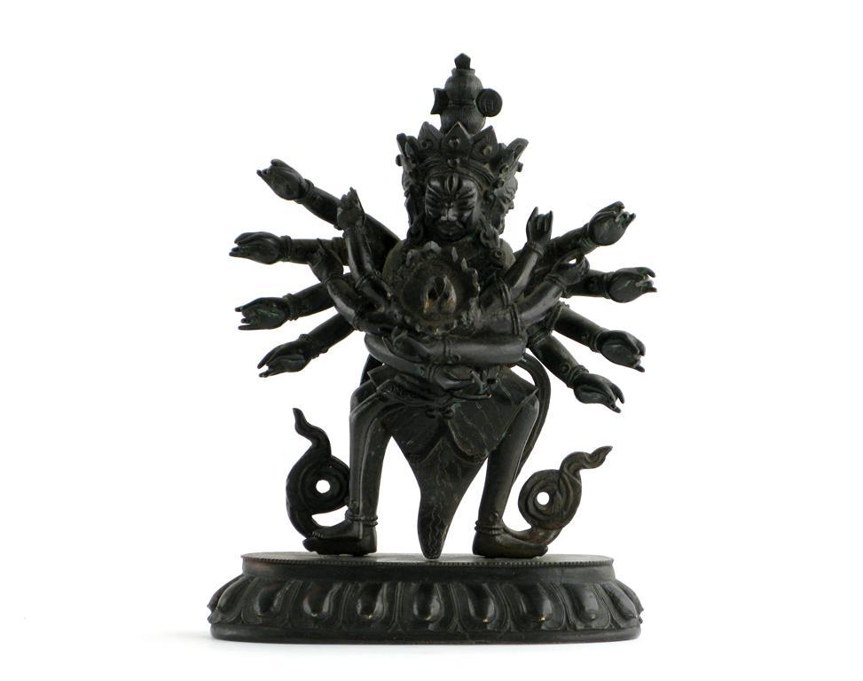 ** A Chinese bronze Tantric figure of a four-faced Mahakala, in yab-yum with his shakti, the deity and his consort with four grimacing faces and ten arms, 19th or 20th century, 20cm.