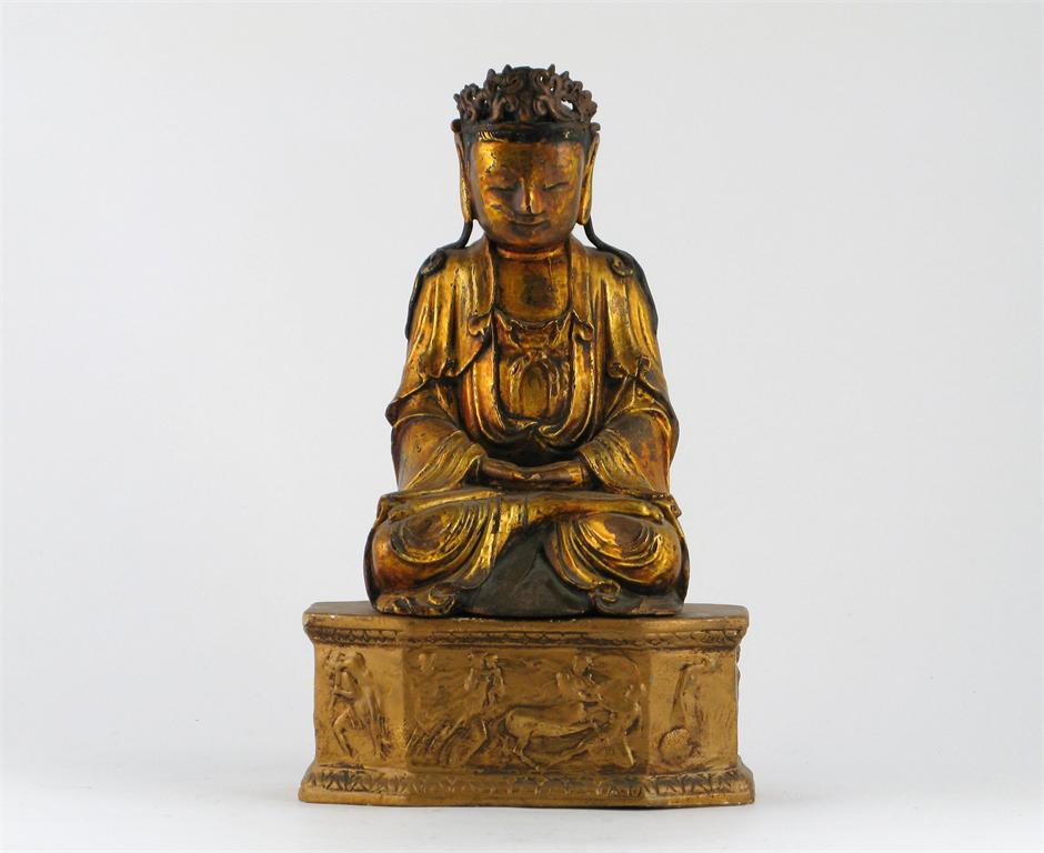 A Chinese gilt wood seated figure of Buddha, probably 17th century, 24cm, on a gold painted plaster stand. (2)