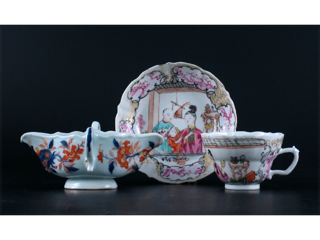 A Chinese Imari double ended sauceboat, and a Chinese famille rose moulded cup and saucer. Minor faults. All 18th century. (3)